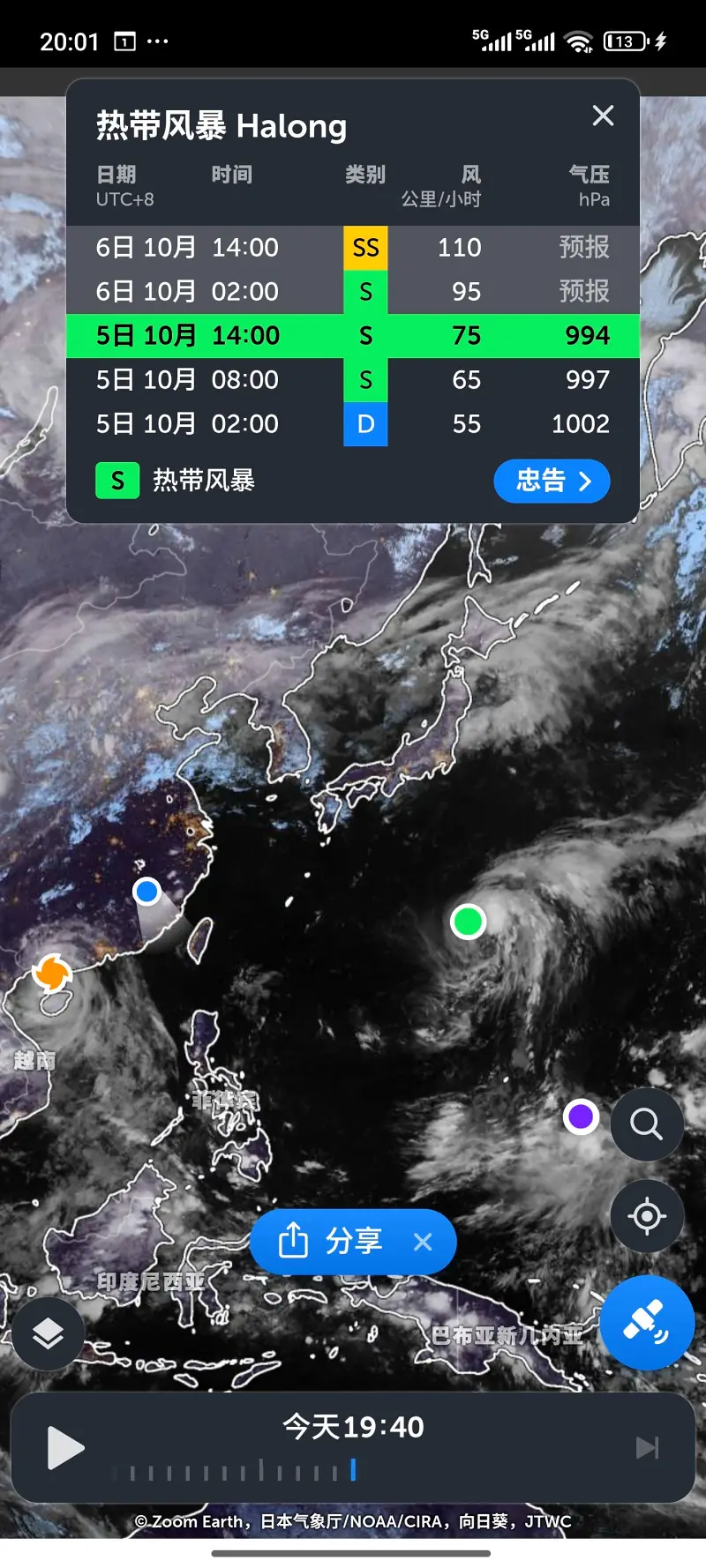 (Zoom Earth)21号台风麦德姆(Matmo)已登录广东湛江一带,预计针对广西沿海二次登陆,22号台风夏浪(Halong)会对日本沿海造成影响 附无解说