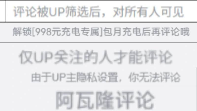 账号封禁/账号异常(容易避免/概率很低),关注7天(较为简单),评论关闭/UP关闭(什么评论都没有,不像UP筛选会刷好评),评论筛选(概率较低),无(这个更不可能)